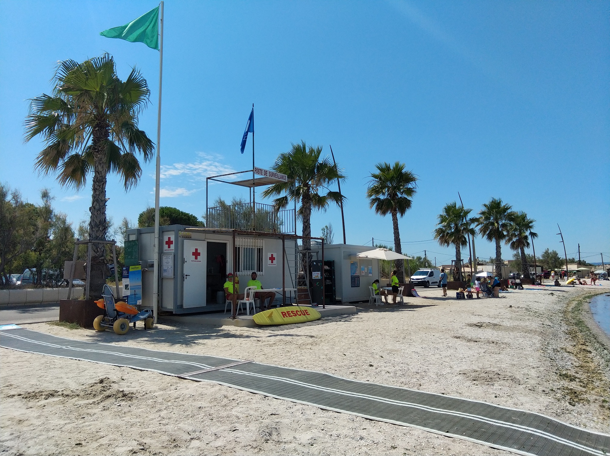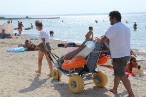 Attention : Les équipiers ne sont pas diplômés handiplagistes, mais bénéficient d’une formation dispensée par des agents handiplagistes et ne peuvent donc pas effectuer les mises à l’eau. Il est obligatoire d’être accompagné par une tierce personne.