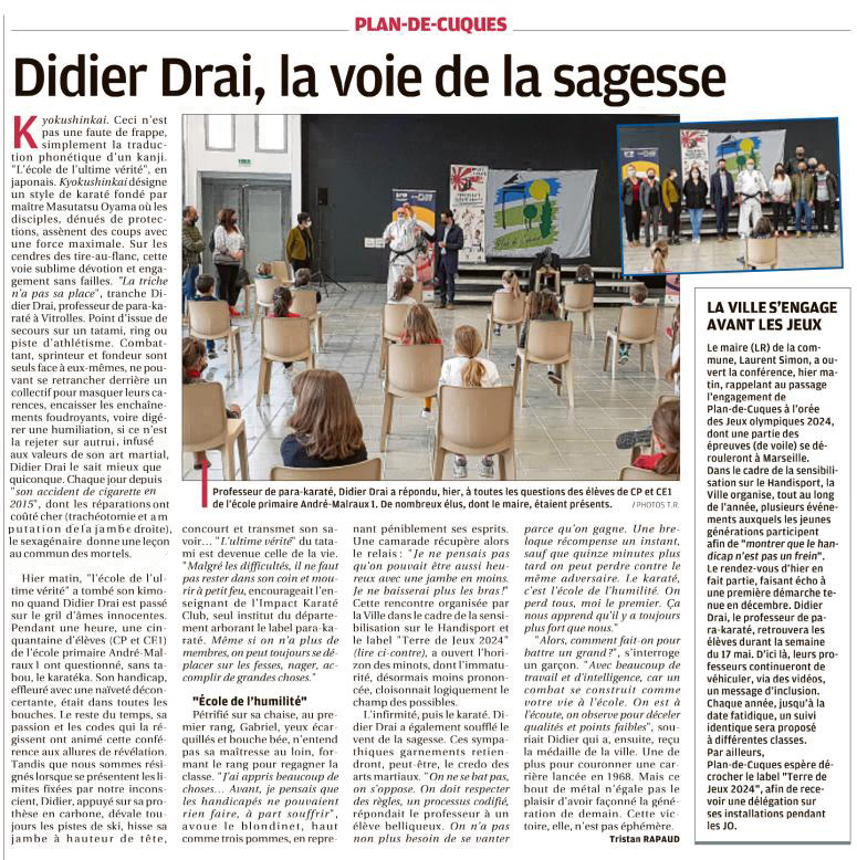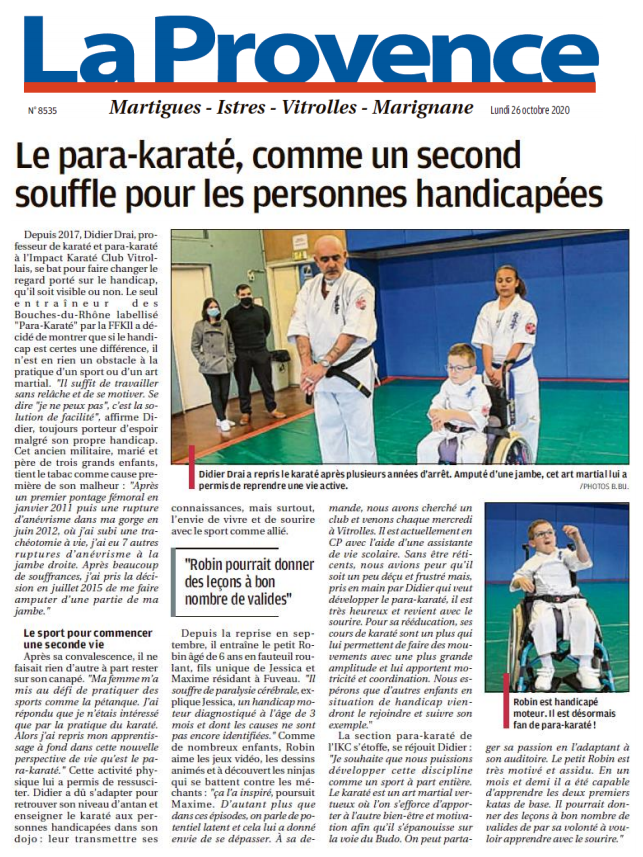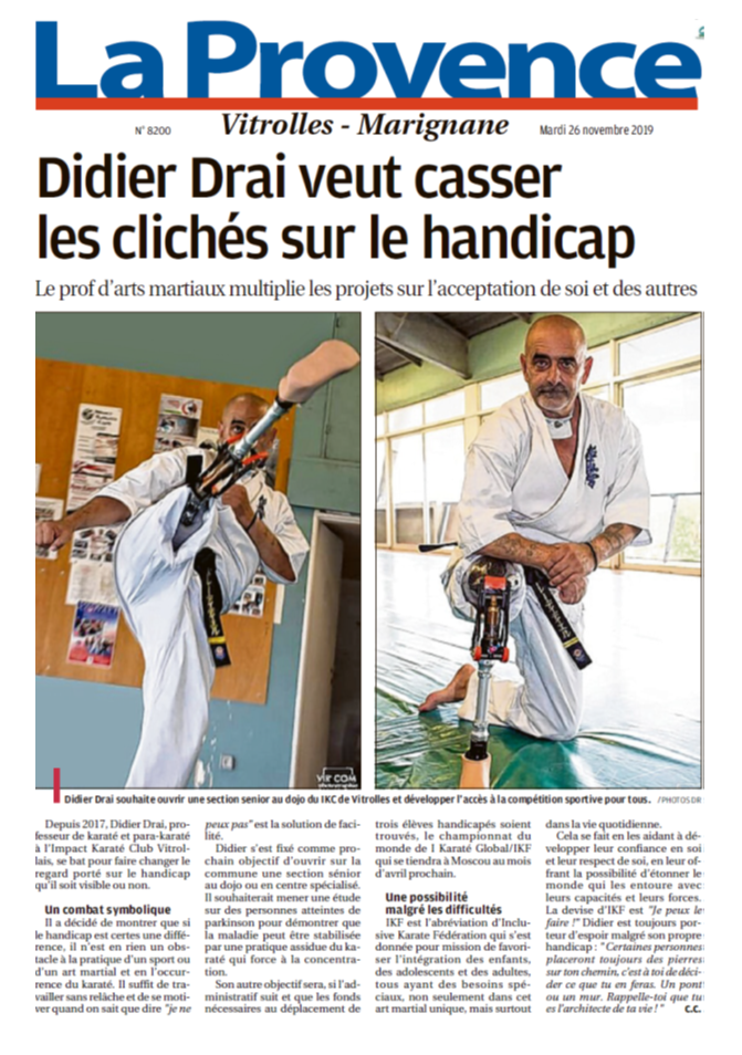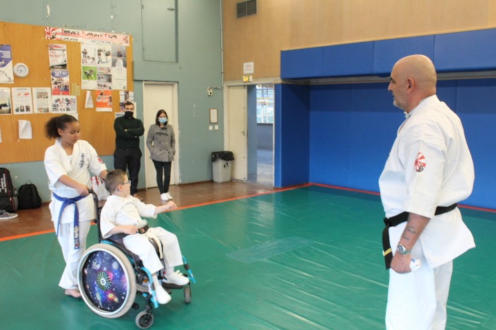 J’ai déjà dans mes cours des enfants en situation de handicap (hyper actif, TDH, DIS) et j’appartiens à ce monde puisque amputé fémoral depuis onze ans, j’ai porté une canule parlante pendant douze années consécutives. Je suis également Labellisé “Para-Karaté” par la Fédération Française de Karaté et Disciplines Associées. Il m’arrive d’intervenir dans des Clubs, Dojo dans les Bouches du Rhône, Côte d’Azur et l’Hérault dans le cadre de l’inclusion pour faire découvrir que le handicap ne veut pas dire “plus bon à rien” et je possède de nombreux articles de presse.